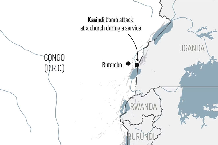 A Congolese military spokesman, Antony Mualushayi, said the “terrorist act” happened in a Pentecostal church in North Kivu province’s Kasindi, a town on the border with Uganda. The explosion killed at least 10 people and wounded 39, he added, revising up an initial death toll of five. Both tolls were provisional, the spokesman said.