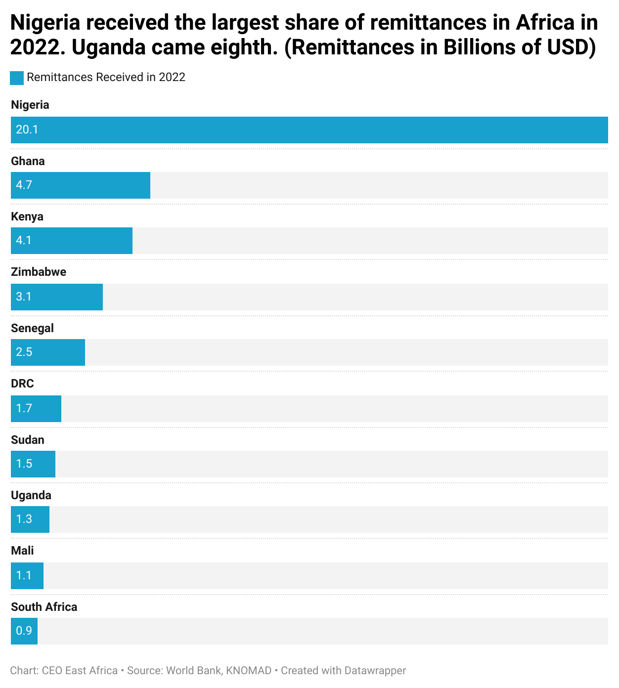 In 2022, Uganda received USD 1.3bn in remittances from its diaspora community according to a World Bank and KNOMAD report. This would account for about 4.5% of Uganda’s GDP and make Uganda the 8th biggest recipient of remittances below Sudan and DRC, but ahead of Mali and South Africa.